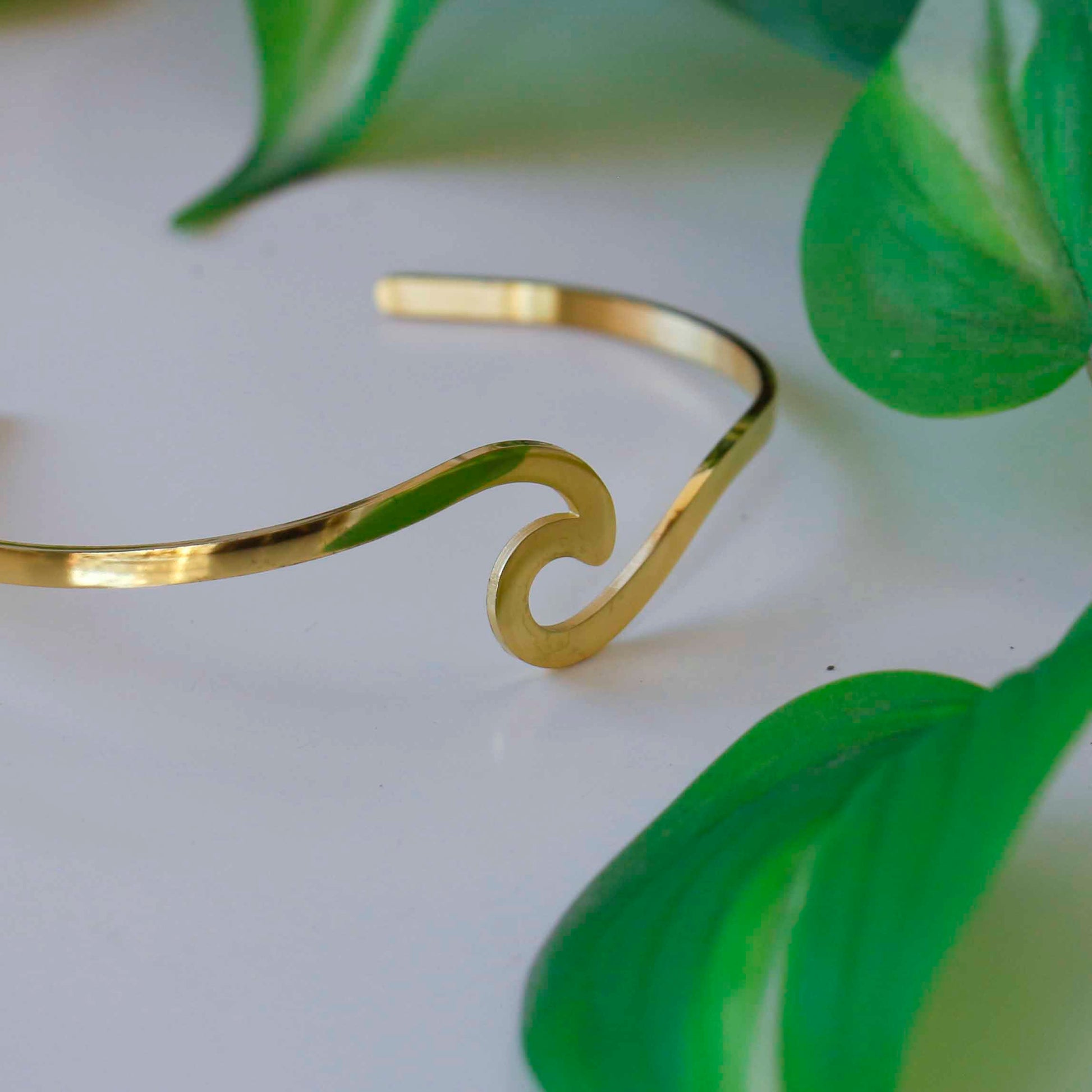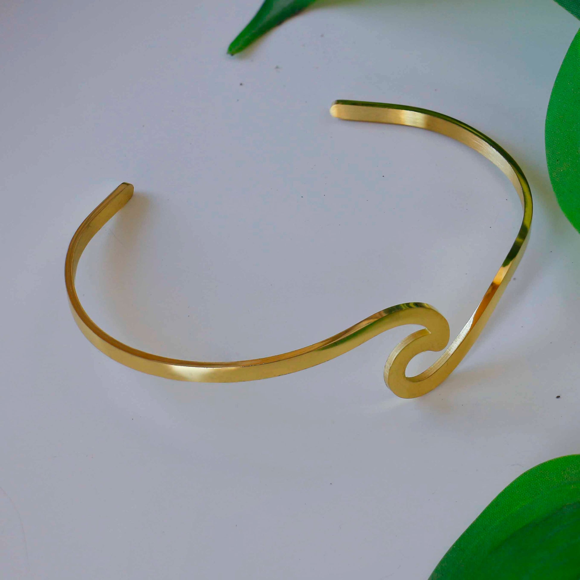 Μια μίνιμαλ αλλά εντυπωσιακή χειροπέδα σε χρυσή απόχρωση, εμπνευσμένη από την αέναη κίνηση των κυμάτων. Το κομψό της σχέδιο με τη ρευστή καμπύλη αποπνέει ηρεμία, ισορροπία και ελευθερία. Ιδανική για όσους αγαπούν τη θάλασσα και αναζητούν ένα διακριτικό κόσμημα με φυσική αρμονία.